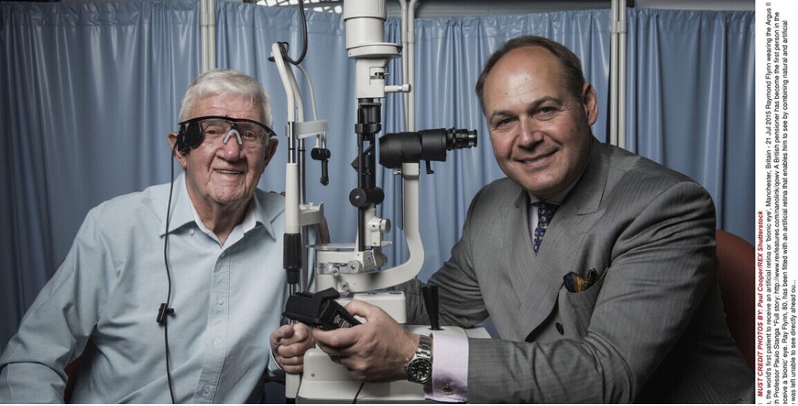 首例手术的对象病患是80岁的英国男性瑞-弗林(Ray Flynn);他因干性视网膜黄斑变性而失去了正面视觉。弗林术后可以“看到”眼前横、竖和斜线,他能够辨识出人脸,不需要放大镜阅读报纸。
