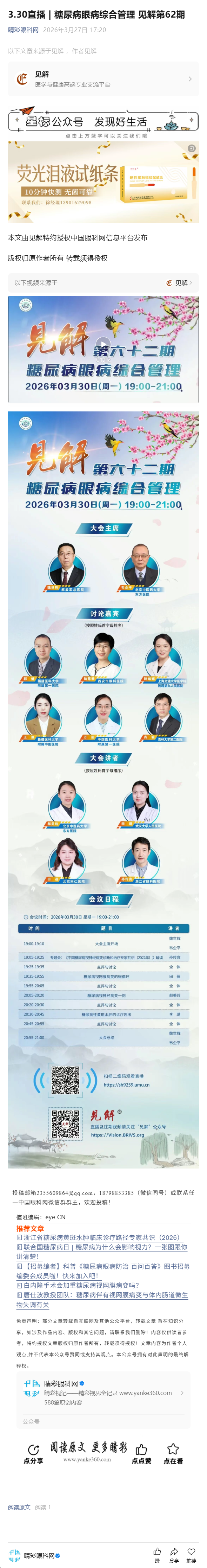 新闻中心 您的当前位置:首页 > 新闻中心 > 3.30直播 | 糖尿病眼 3.30直播 | 糖尿病眼病综合管理 见解第62期-------2026-3-27 发布时间:2026-03-27 来源: 作者: