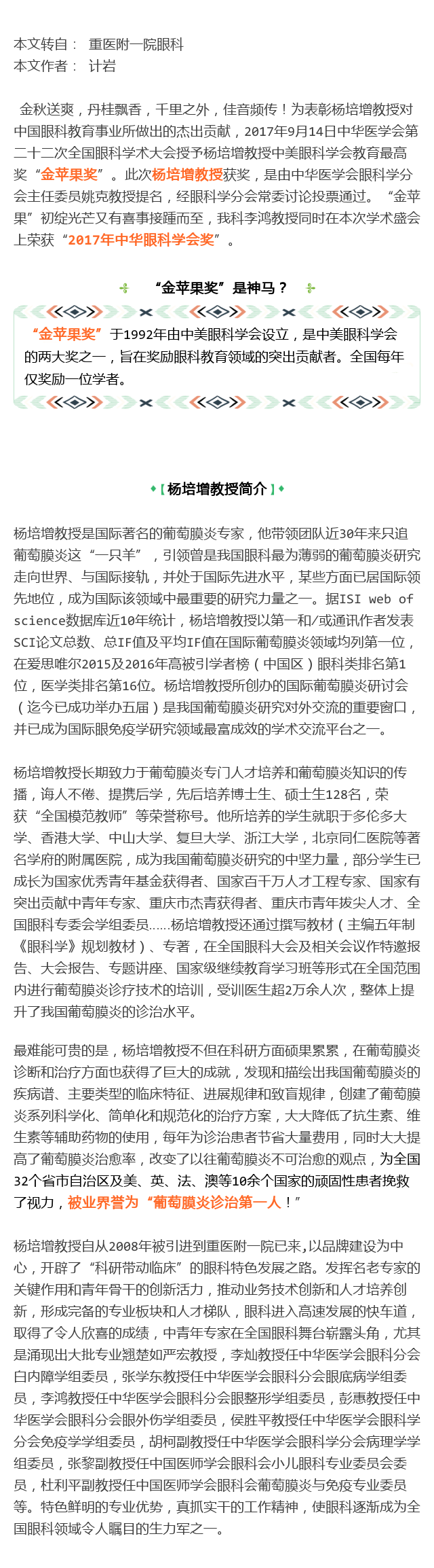 新闻中心 您的当前位置:首页 > 新闻中心 > 厉兵秣马稇载而归,不 厉兵秣马稇载而归,不忘初心砥砺前行——热烈祝贺杨培增教授、李鸿教授喜获全国眼科大奖------------------------------------------------2017-09-27 发布时间:2017-09-27 来源: 作者: 原文链接 更多新闻请点击: http://www.yanke360.com/news/