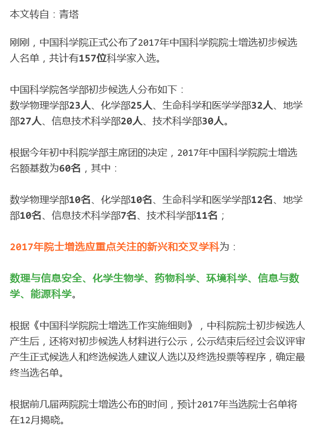 新闻中心 您的当前位置:首页 > 新闻中心 > 重磅:2017年中国科学 重磅:2017年中国科学院院士增选初步候选人名单出炉!------------------2017-08-02 发布时间:2017-08-02 来源: 作者: 原文链接 更多新闻请点击: http://www.yanke360.com/news/