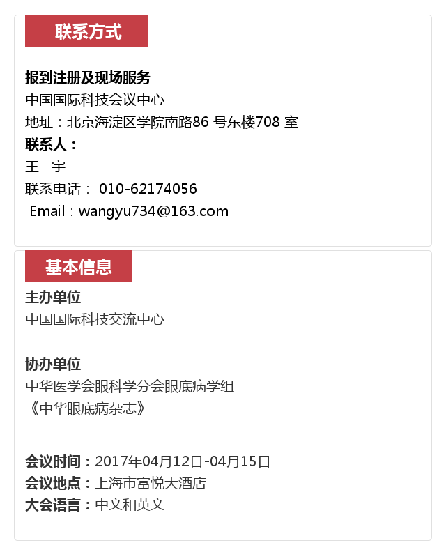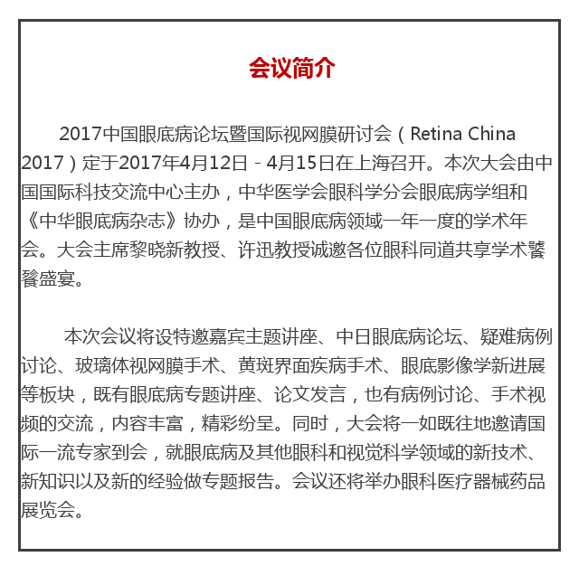 新闻中心 您的当前位置:首页 > 新闻中心 > 2017中国眼底病论坛暨 2017中国眼底病论坛暨国际视网膜研讨会(04.12-04.15上海)---------------2017-03-31 发布时间:2017-03-31 来源: 作者: 详情请点击:眼底病会议官方网站 (一切信息以官方网站为准) 更多新闻请点击: http://www.yanke360.com/news/
