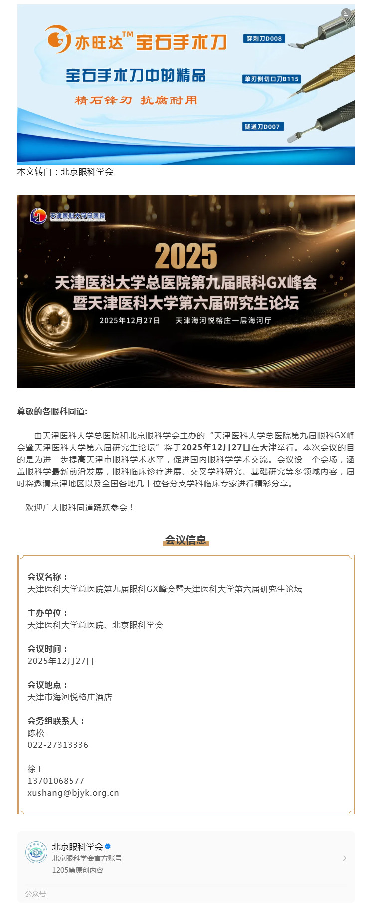 12.27天津 | 天津医科大学总医院第九届眼科GX峰会暨天津医科大学第六届研究生论坛 第一轮通知---2025-12-02 发布时间:2025-12-02 来源: 作者: