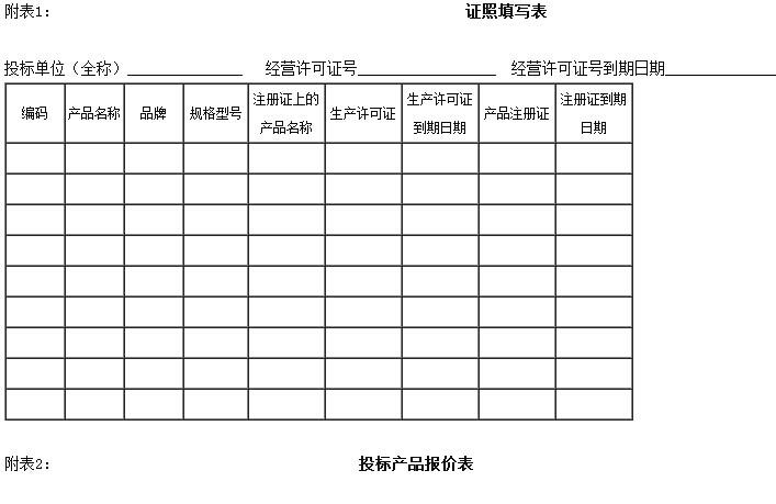 本次招标附表两份,附表(一)为证照填写表,附表(二)为投标报价表,附表(一)和附表(二)组成本次招标的电子版。