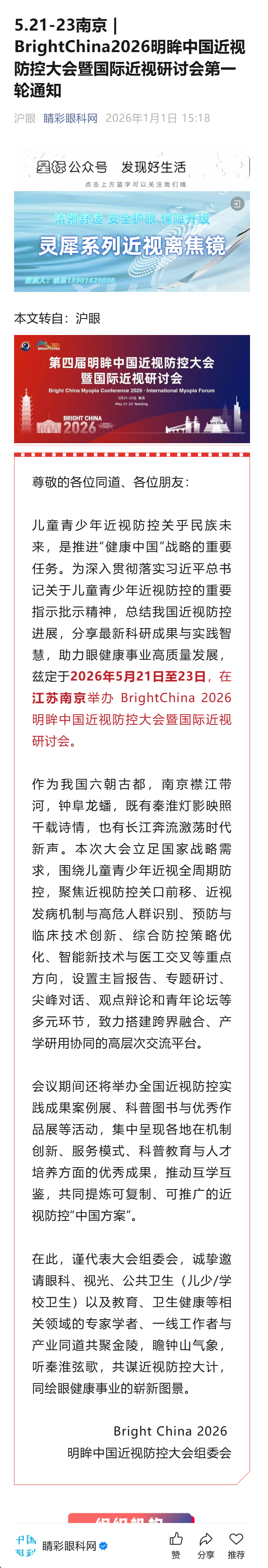 新闻中心 您的当前位置:首页 > 新闻中心 > 5.21-23南京 | Bright 5.21-23南京 | BrightChina2026明眸中国近视防控大会暨国际近视研讨会第一轮通知-----2026-01-01 发布时间:2026-01-01 来源: 作者: