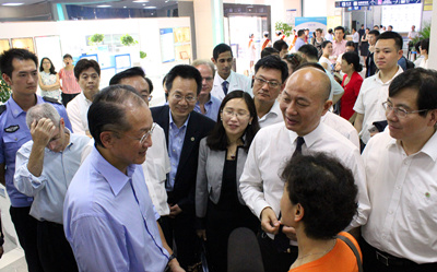 2014年7月9日,世界银行集团行长金墉先生在财政部副部长史耀斌、湖南省政府副省长李友志的陪同下,参观考察了长沙爱尔眼科医院。爱尔眼科医院集团董事长陈邦先生、爱尔医疗投资集团张跃文总裁、爱尔眼科医院集团总院长、中南大学爱尔眼科学院院长唐仕波教授代表全体爱尔人接待了金墉先生一行,并向尊贵的客人做了详细介绍。