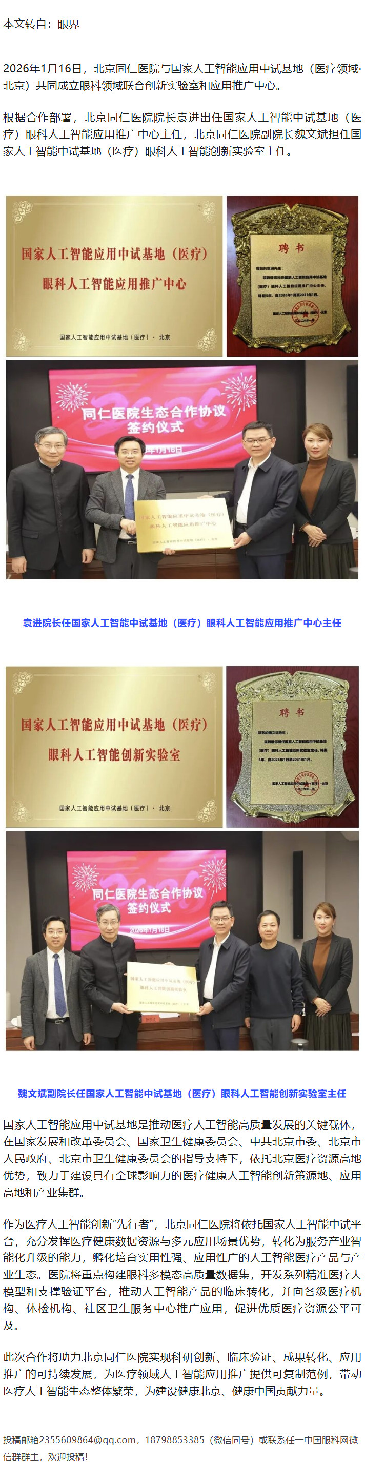 北京同仁医院与国家人工智能应用中试基地共建眼科领域联合创新实验室和应用推广中心2026.1.19 发布时间:2026-01-19 来源: 作者: