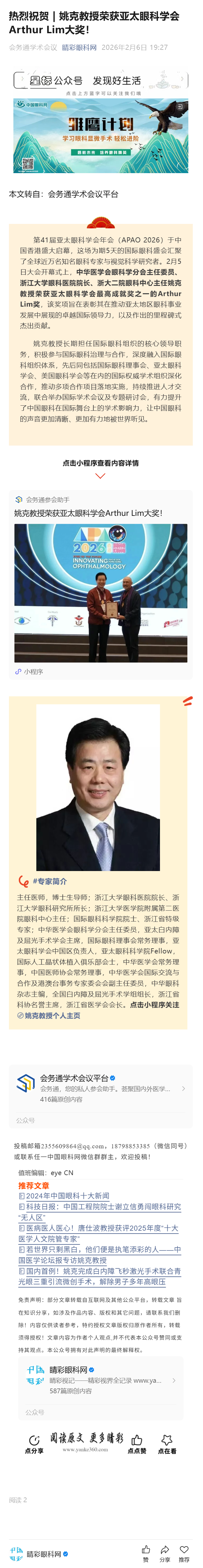 新闻中心 您的当前位置:首页 > 新闻中心 > 热烈祝贺 | 姚克教授 热烈祝贺 | 姚克教授荣获亚太眼科学会Arthur Lim大奖!------2026-2-6 发布时间:2026-02-06 来源: 作者: