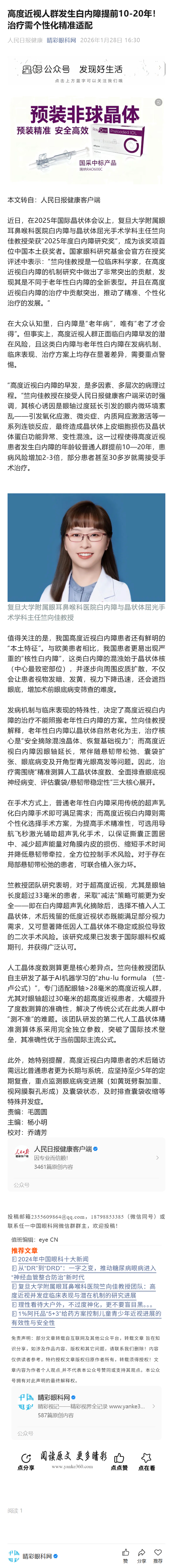 新闻中心 您的当前位置:首页 > 新闻中心 > 高度近视人群发生白内 高度近视人群发生白内障提前10-20年!治疗需个性化精准适配----2026-1-28 发布时间:2026-01-28 来源: 作者: