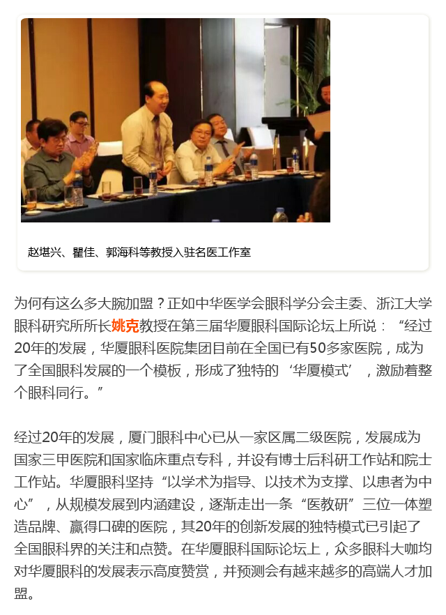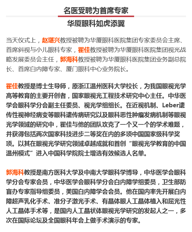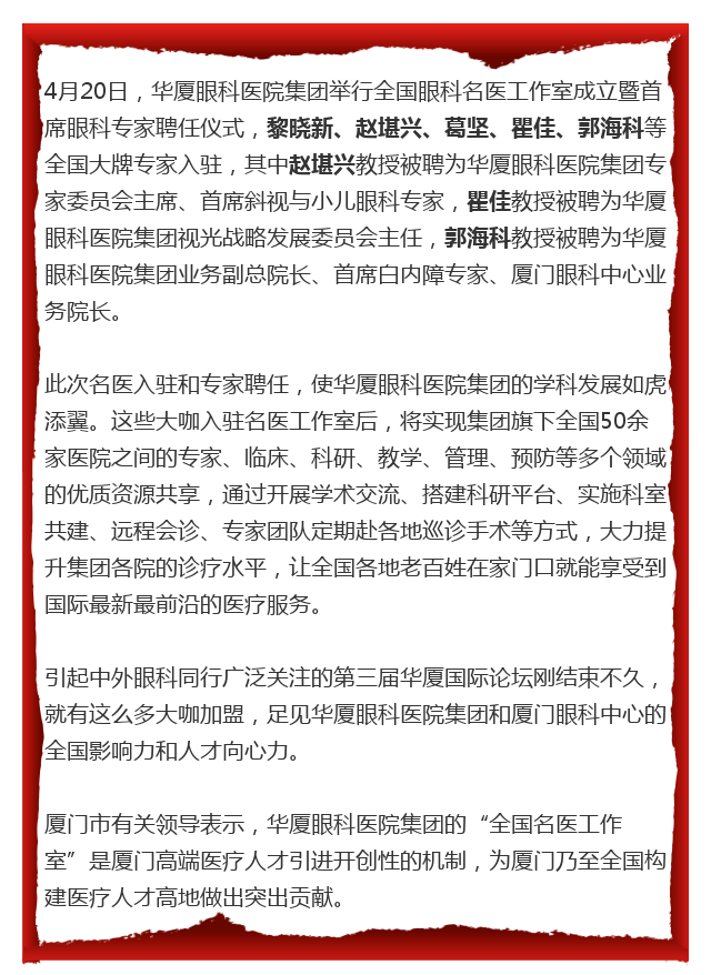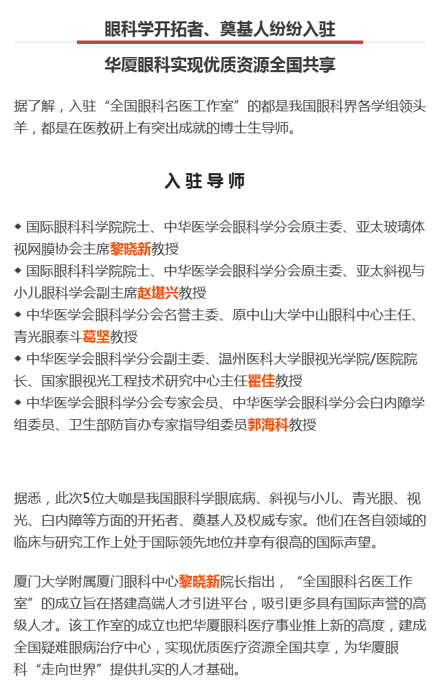 新闻中心 您的当前位置:首页 > 新闻中心 > 华厦眼科“全国眼科名 华厦眼科“全国眼科名医工作室”成立,黎晓新、赵堪兴、葛坚、瞿佳、郭海科等大咖入驻--------------------2017-04-21 发布时间:2017-04-21 来源:华厦眼科医院集团 作者: 本文由华厦眼科医院集团特约授 权中国眼科网信息平台发布 原文链接 更多新闻请点击: http://www.yanke360.com/news/
