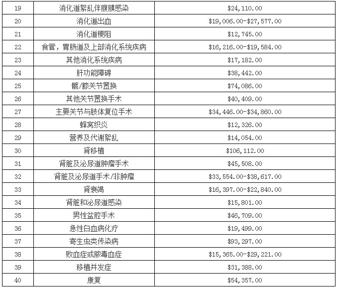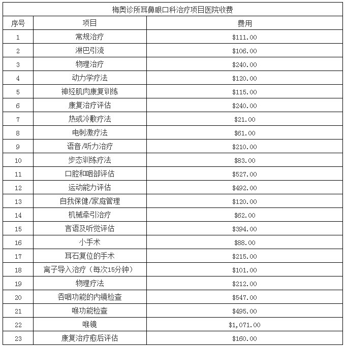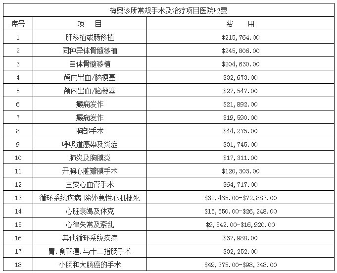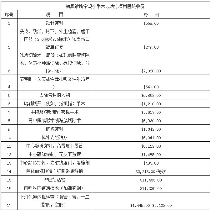 为了方便有出国就医需要的朋友们能够对出行花费有大致预估,我公司将美国2015年度综合排名第一的医院梅奥诊所的《医疗服务费用价目表》整理翻译成了中文版供大家参考。价目表是2014年底下载于梅奥诊所官网,是梅奥诊所的公开材料,大家也可以在梅奥诊所官网下载最新的英文版价格表进行参考。由于医疗费用因为个体因素差距很大,同一所医院相同的疾病也可能治疗费用相差数倍,所以此价格单只是给大家一个参考,具体治疗费用还是以医院评估为准。