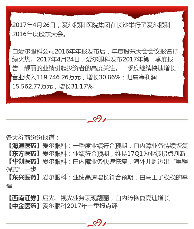 新闻中心 您的当前位置:首页 > 新闻中心 > 爱尔眼科2016年度股东 爱尔眼科2016年度股东大会(2017.04.26)-----------------------------------------2017-04-28 发布时间:2017-04-28 来源: 作者: 本文转自:爱尔眼科投资者关系 原文联系 更多新闻请点击: http://www.yanke360.com/news/