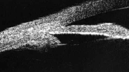 解释:急闭青发作,上方房角最容易粘连。上方房角的广泛粘连“牵拉”上方虹膜向上移位,下方虹膜由于重力作用向下移位,导致瞳孔成竖椭圆形。
