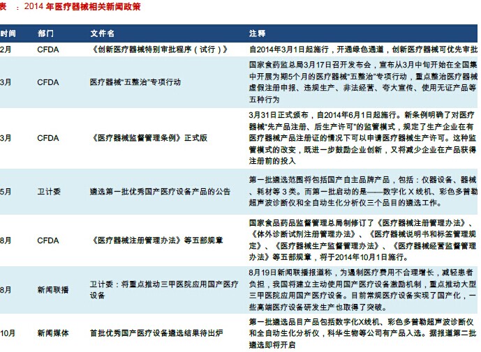 2014年是医疗器械政策大年,政策大环境对国内医疗器械龙头利好明显,主要体现在: