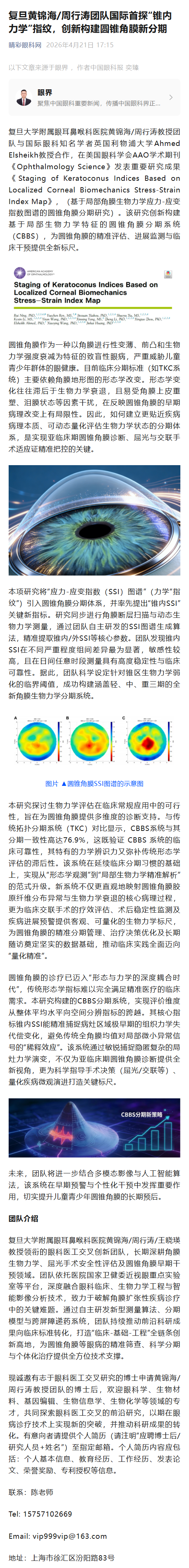 新闻中心 您的当前位置:首页 > 新闻中心 > 复旦黄锦海/周行涛团 复旦黄锦海/周行涛团队国际首探“锥内力学”指纹,创新构建圆锥角膜新分期----2026-4-21 发布时间:2026-04-21 来源: 作者: