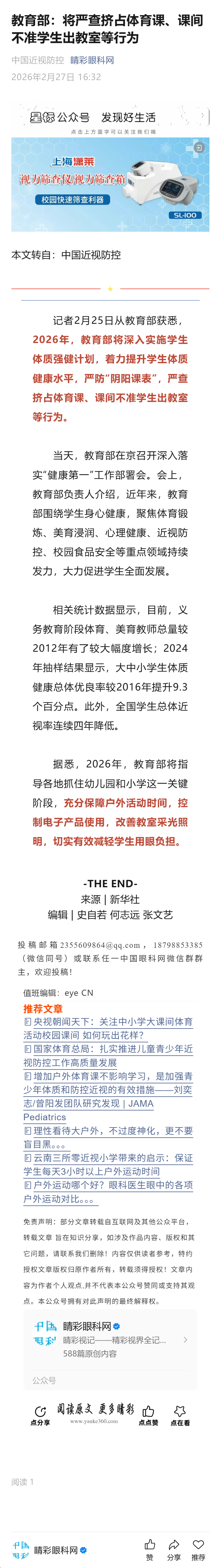 教育部:将严查挤占体育课、课间不准学生出教室等行为-------2026-2-27