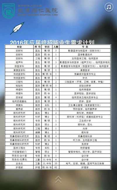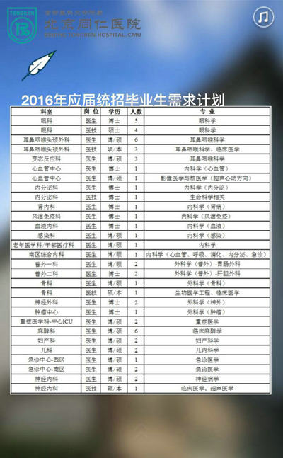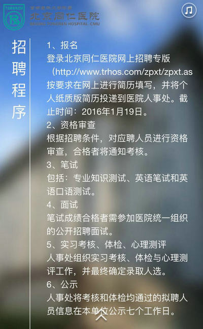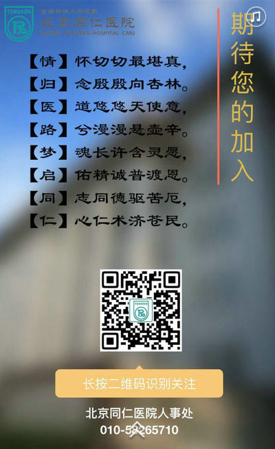 新闻中心 您的当前位置:首页 > 新闻中心 > 北京同仁医院招聘啦! 北京同仁医院招聘啦!2016年遇见最好的自己------------------------------------------------2016-01-18 发布时间:2016-01-18 来源: 作者: 北京同仁医院2016年应届毕业招聘公告 更多新闻请点击:http://www.yanke360.com/news/