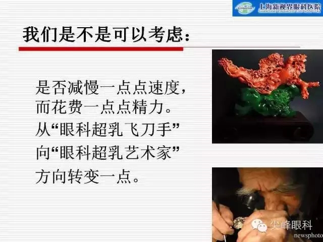 我们是不是可以考虑:是否减慢一点点速度,而在精益求精上、极尽完美上花费一点点精力,花费几分钟时间。把我们自己从“眼科超乳飞刀手”向“眼科超乳艺术家”方向转变一点点。
