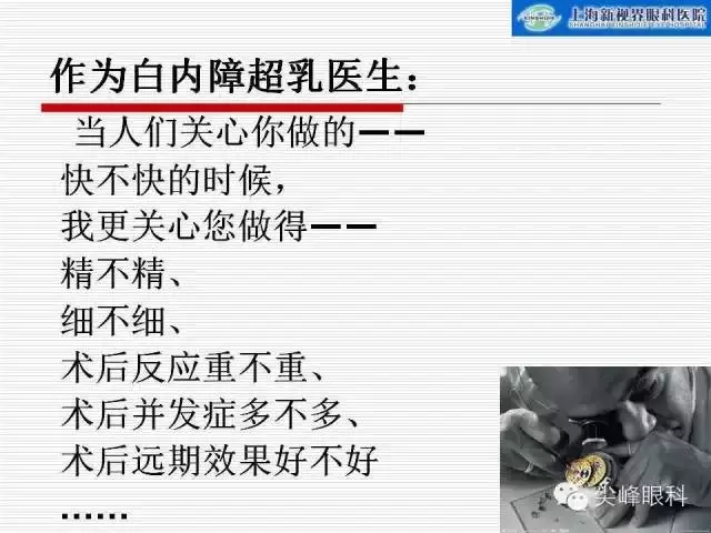 作为白内障超乳医生,当人们关心你做的快不快的时候,我更关心您做得精不精、细不细,术后反应重不重,术后并发症多不多,术后远期效果好不好。