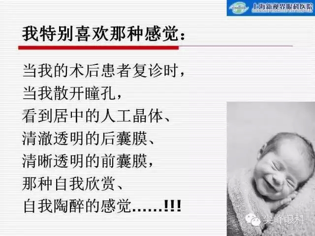 每一台手术,每一个眼球都是我们眼科医生追求极尽完美技术的一件艺术品。我特别喜欢那种感觉:当我的白内障术后患者在术后半年、一年、两年、三~五年以后再返回我这里复诊的时候,当我散开瞳孔,看到居中的人工晶体、清澈透明的后囊膜、清晰透明的前囊膜,或者只有一个淡淡部分灰白色增殖的前囊膜时候,那种自我欣赏、自我陶醉的感觉……