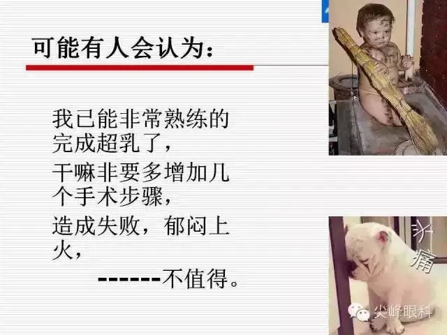 回顾一下,当年由ECCE向超乳转变过程中,有多少人也是不愿意接受的。的确在初始阶段,我们都会遇到很多挫折和失败,甚至想放弃。但是当您经过坚持不懈的努力,熟练掌握了一些手术技巧,游刃有余的时候,那种感觉真的很~~~~~~