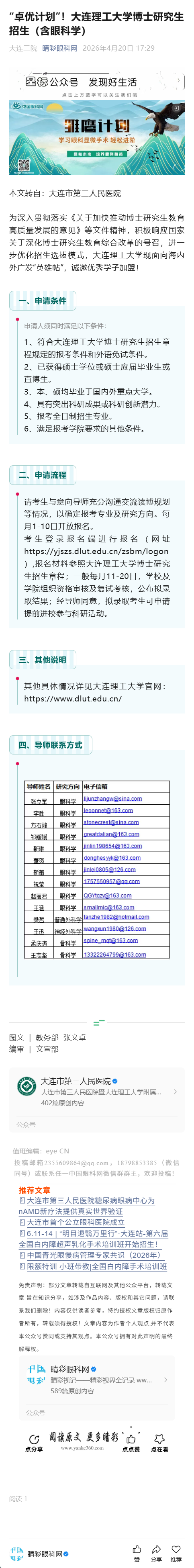 “卓优计划”!大连理工大学博士研究生招生(含眼科学)-----2026-4-20