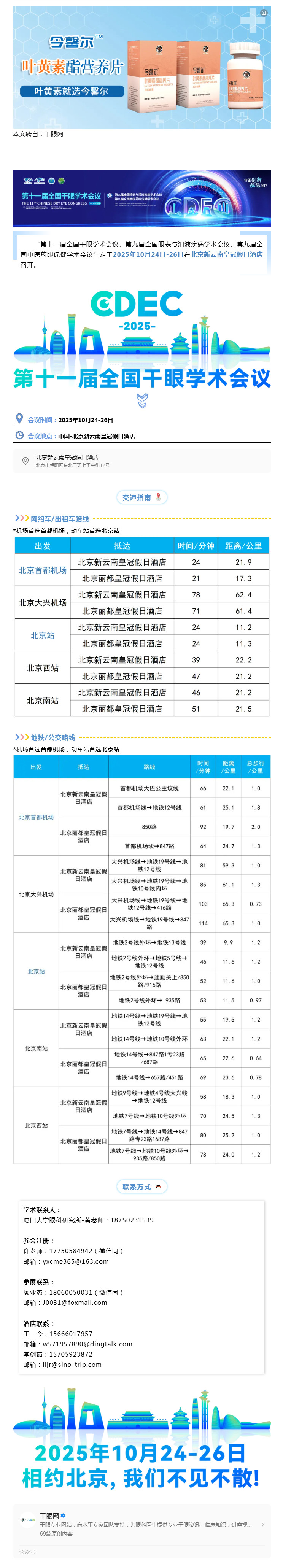 10.24-26北京|第十一届全国干眼学术会议、第九届全国眼表与泪液疾病学术会议、第九届全国中医药眼保健学术会议(参会交通指南)---2025-10-22 发布时间:2025-10-22 来源: 作者: