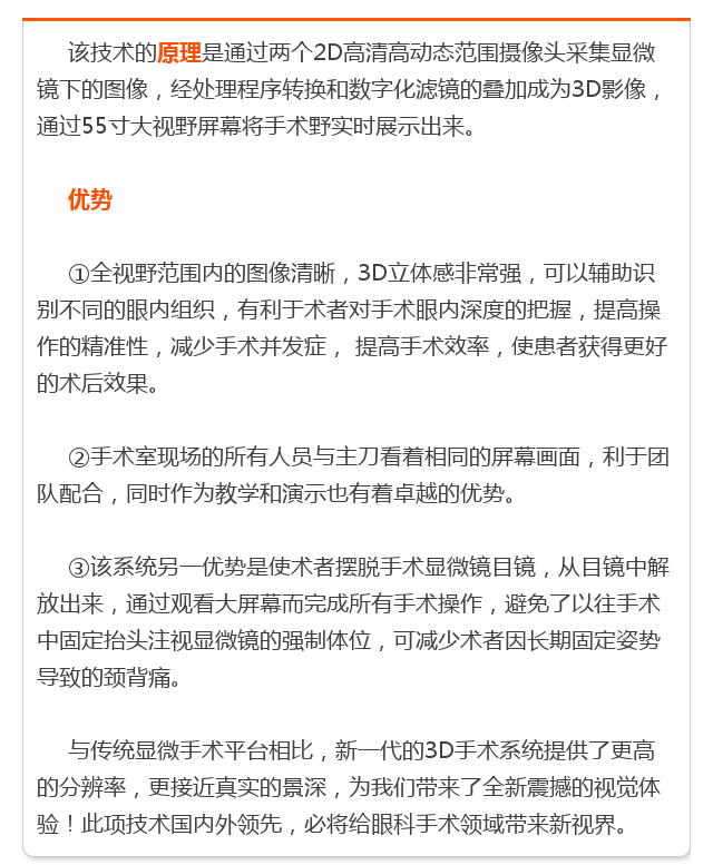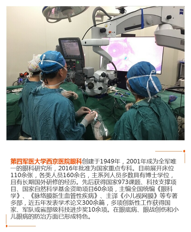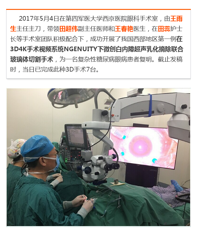 新闻中心 您的当前位置:首页 > 新闻中心 > 西京医院开创全新3D眼 西京医院开创全新3D眼科手术先河--------------------2017-05-05 发布时间:2017-05-05 来源: 作者: 本文转自:寻色 本文作者:田蕊 原文链接 更多新闻请点击: http://www.yanke360.com/news/