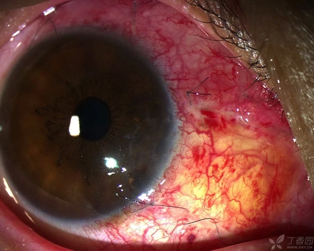 这是一例翼状胬肉,手术过程中我们采取逆行撕除法,没有对角膜进行任何搔刮,术后角膜完全透明无斑翳。我们采取连续缝合法,植片平整,伤口对合好,术后反应轻,愈后结膜无明显疤痕。对于供区创面要缝合,尽量不影响以后的青光眼手术。这是术前,胬肉较大,充血明显,较肥厚。