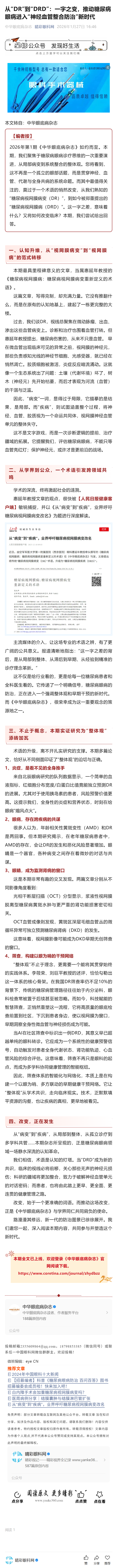 新闻中心 您的当前位置:首页 > 新闻中心 > 从“DR”到“DRD”: 从“DR”到“DRD”:一字之变,推动糖尿病眼病进入“神经血管整合防治”新时代------2026-1-27 发布时间:2026-01-27 来源: 作者: