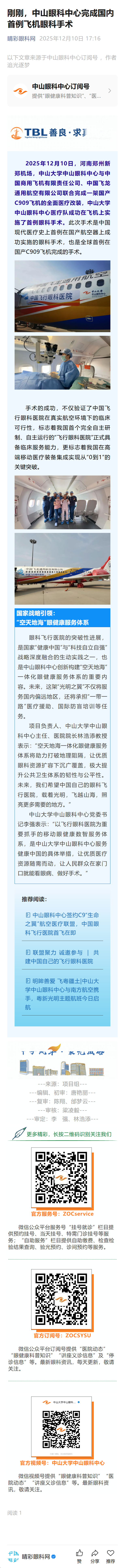 刚刚,中山眼科中心完成国内首例飞机眼科手术----------2025-12-10