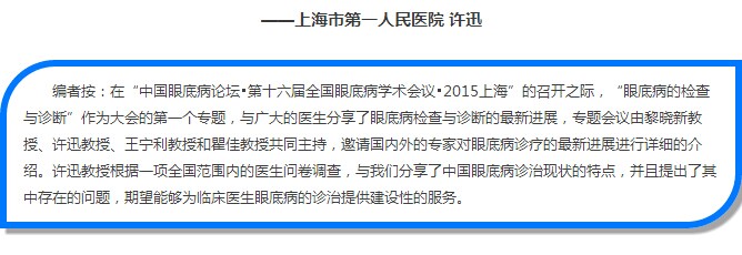 根据中国常见眼底病的临床诊治现状的调查,许迅教授向我们展示了中国地区眼底病专科医生对常见眼底疾病:糖尿病性视网膜病变、视网膜血管阻塞、湿性AMD以及视网膜脱离的诊治现状,对每一个较有争议的问题进行详细的剖析,并提出相应的解决方案,期望能够对全国眼底病的诊治的规范化有所帮助,加深广大眼科医师对眼底病诊治的认识,以避免临床误诊误治,从而提高患者的生活质量。