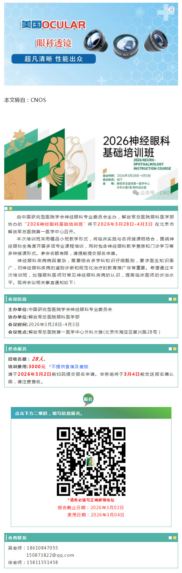 2026神经眼科基础培训班(春季班)报名通知!(3.28-4.3北京)--2026-02-12 发布时间:2026-02-12 来源: 作者: