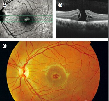 该患者的自发荧光照片(A),OCT 检查结果(B)以及彩色眼底照片(C)显示患者为显著的黄斑裂孔。