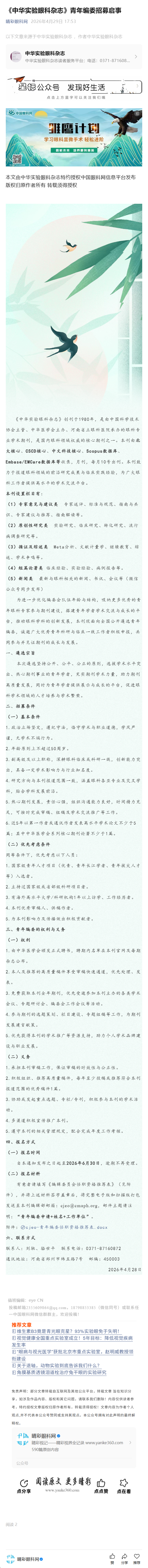 《中华实验眼科杂志》青年编委招募启事----2026-4-29