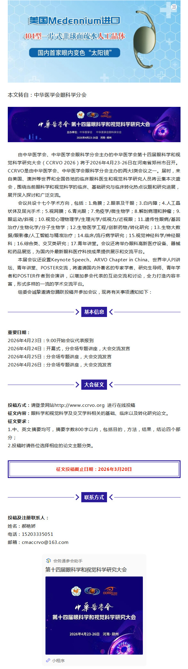 征文通知 | 中华医学会第十四届眼科学和视觉科学研究大会 (CCRVO 2026)(4.23-26郑州)--2026-02-12 发布时间:2026-02-12 来源: 作者:
