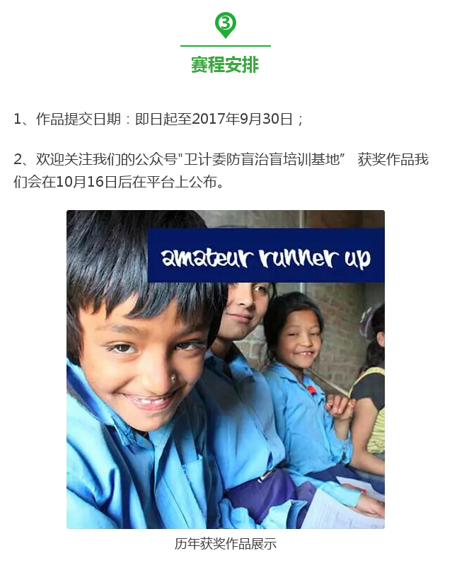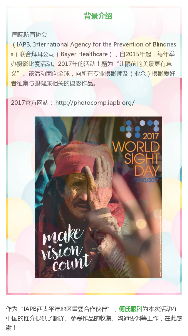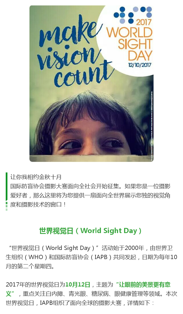 新闻中心 您的当前位置:首页 > 新闻中心 > 【相约十月】国际防盲 【相约十月】国际防盲协会摄影大赛作品征集开始啦!---------------------------2017-05-02 发布时间:2017-05-02 来源: 作者: 本文转自: 卫计委防盲治盲培训 基地 原文链接 更多新闻请点击: http://www.yanke360.com/news/