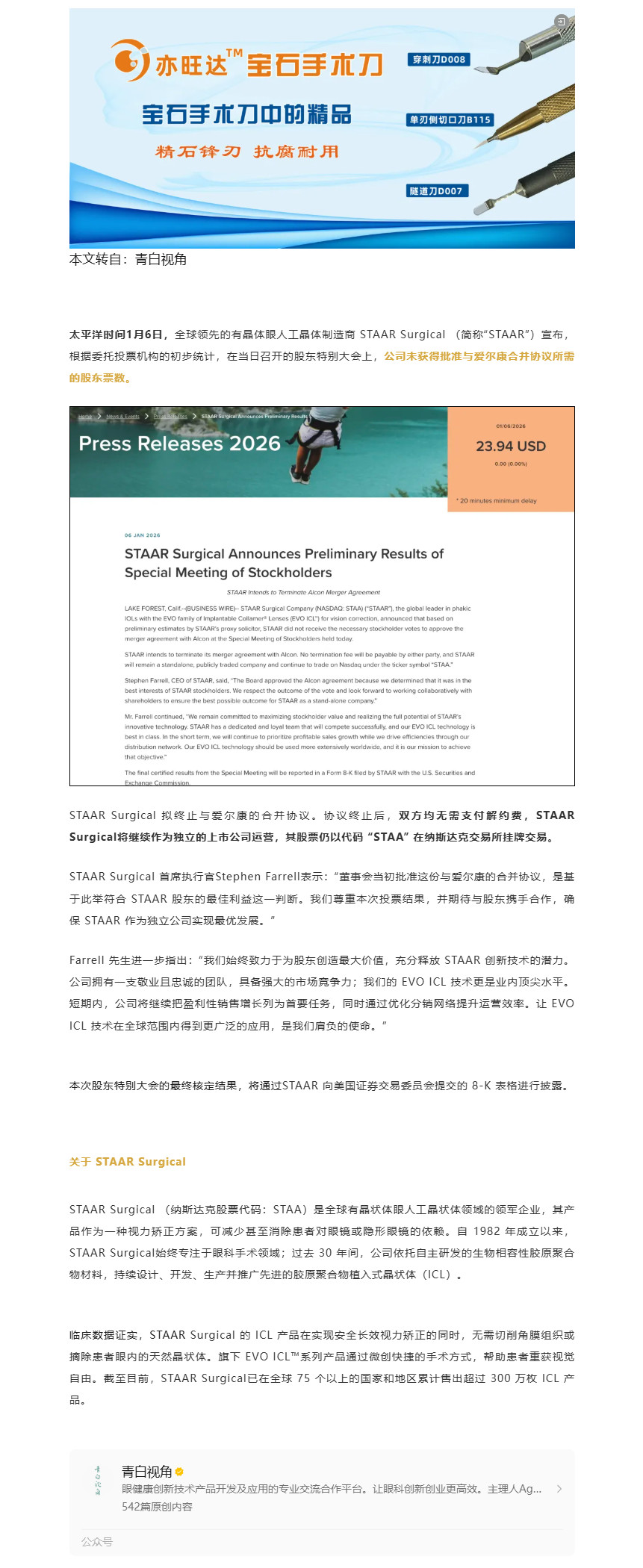 终止!STAAR公布股东特别大会初步表决结果公司拟终止与爱尔康的合并协议---2026-01-08 发布时间:2026-01-08 来源: 作者: