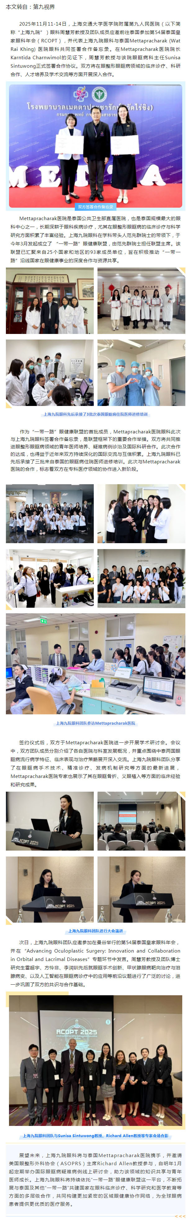共促中泰眼科领域合作,上海九院眼科与泰国Mettapracharak医院眼科签署合作备忘录--2025-11-24 发布时间:2025-11-24 来源: 作者: