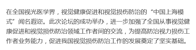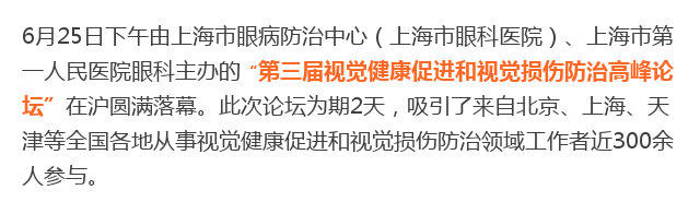 新闻中心 您的当前位置:首页 > 新闻中心 > 第三届视觉健康促进和 第三届视觉健康促进和视觉损伤防治高峰论坛在沪圆满落幕-------------------2017-06-26 发布时间:2017-06-26 来源: 作者: 原文链接 更多新闻请点击: http://www.yanke360.com/news/