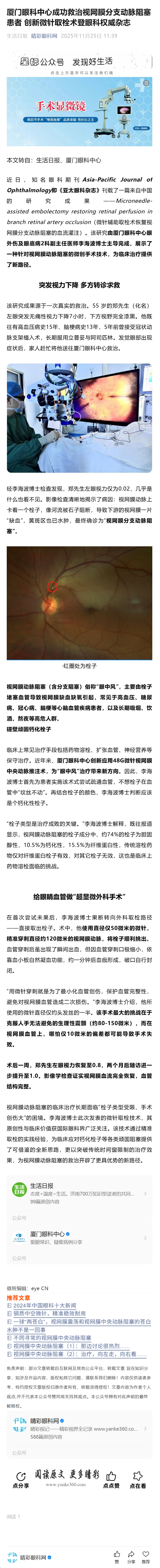 新闻中心 您的当前位置:首页 > 新闻中心 > 厦门眼科中心成功救治 厦门眼科中心成功救治视网膜分支动脉阻塞患者 创新微针取栓术登眼科权威杂志--------------2025-11-25 发布时间:2025-11-25 来源: 作者: 原文链接