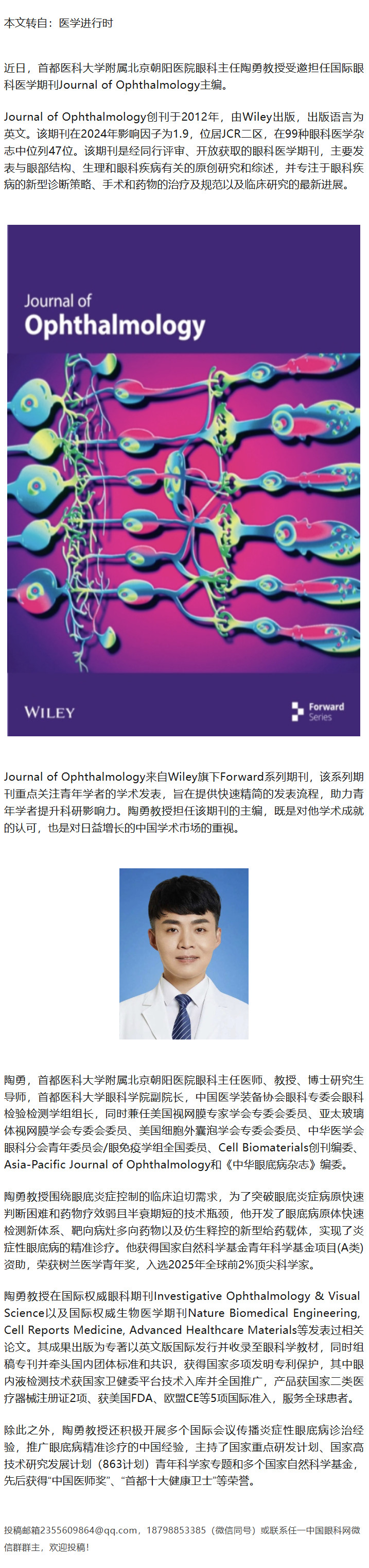 陶勇教授受邀担任国际眼科期刊Journal of Ophthalmology主编---2026.1.15 发布时间:2026-01-15 来源: 作者: