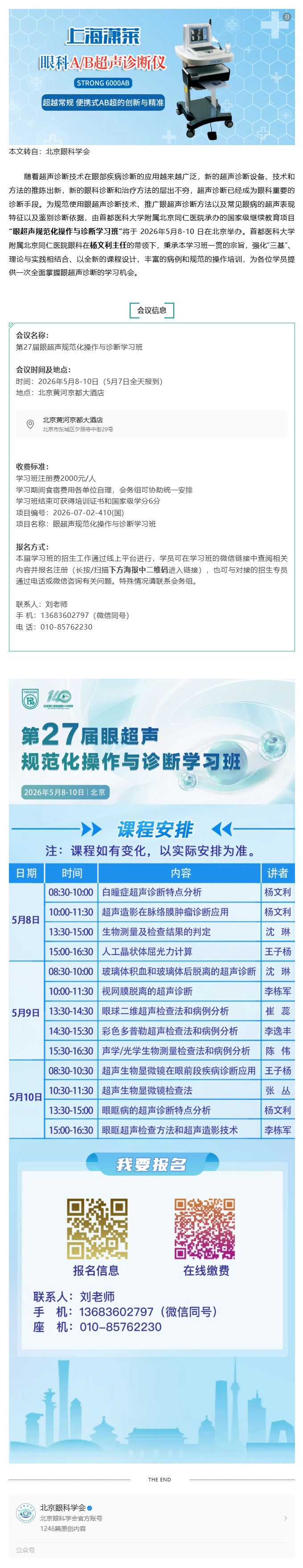 5.8-10北京|第27届眼超声规范化操作与诊断学习班【培训通知】---2026-04-24 发布时间:2026-04-24 来源: 作者: