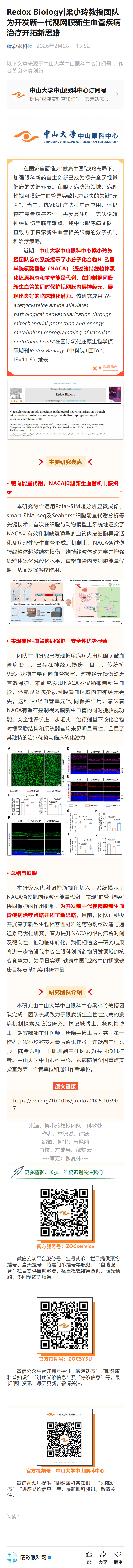 新闻中心 您的当前位置:首页 > 新闻中心 > Redox Biology|梁小玲 Redox Biology|梁小玲教授团队为开发新一代视网膜新生血管疾病治疗开拓新思路----2026-2-28 发布时间:2026-02-28 来源: 作者: