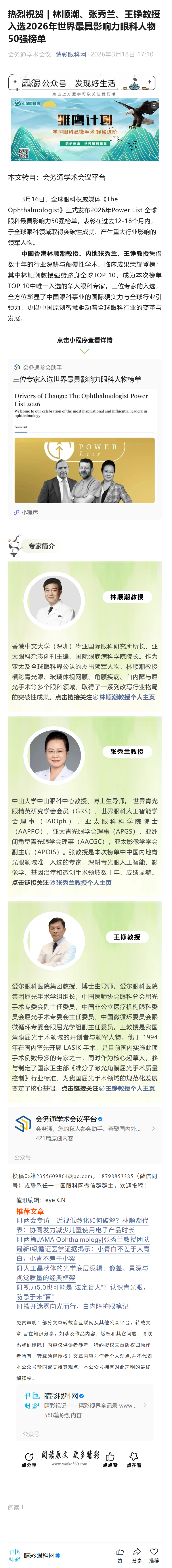 新闻中心 您的当前位置:首页 > 新闻中心 > 热烈祝贺 | 林顺潮、 热烈祝贺 | 林顺潮、张秀兰、王铮教授入选2026年世界最具影响力眼科人物50强榜单----2026-3-18 发布时间:2026-03-18 来源: 作者: