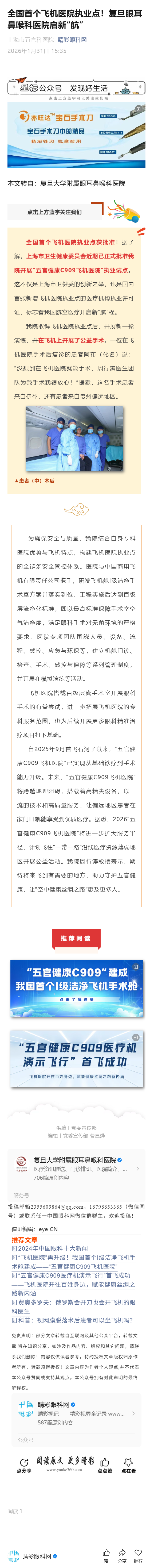 新闻中心 您的当前位置:首页 > 新闻中心 > 全国首个飞机医院执业 全国首个飞机医院执业点!复旦眼耳鼻喉科医院启新“航”-------2026-1-31 发布时间:2026-01-31 来源: 作者: