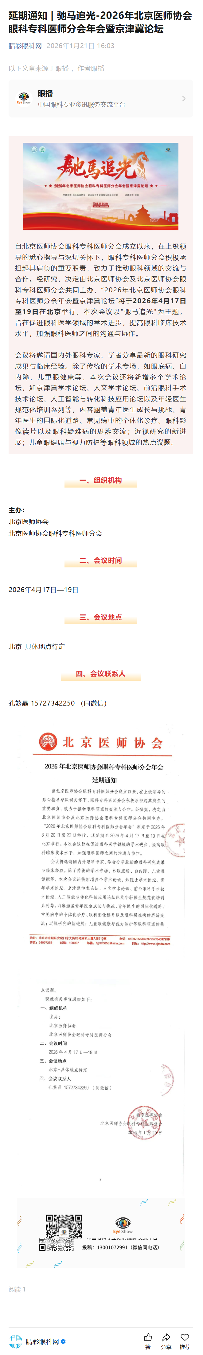 新闻中心 您的当前位置:首页 > 新闻中心 > 延期通知 | 驰马追光- 延期通知 | 驰马追光-2026年北京医师协会眼科专科医师分会年会暨京津冀论坛------2026-1-21 发布时间:2026-01-21 来源: 作者: