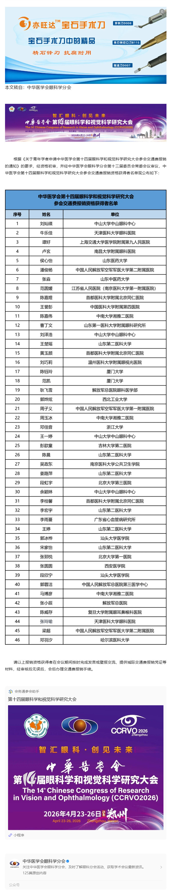 关于公布中华医学会第十四届眼科学和视觉科学研究大会参会交通费报销资格获得者名单的通知---2026-04-22 发布时间:2026-04-22 来源: 作者: