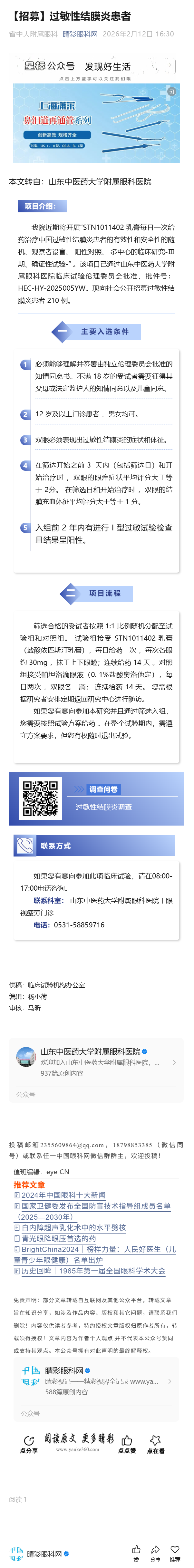 > 【招募】过敏性结膜炎