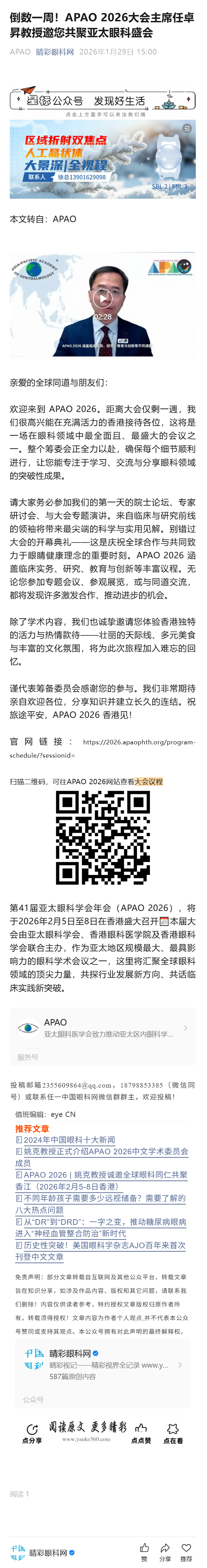新闻中心 您的当前位置:首页 > 新闻中心 > 倒数一周!APAO 2026 倒数一周!APAO 2026大会主席任卓昇教授邀您共聚亚太眼科盛会------2026-1-29 发布时间:2026-01-29 来源: 作者: