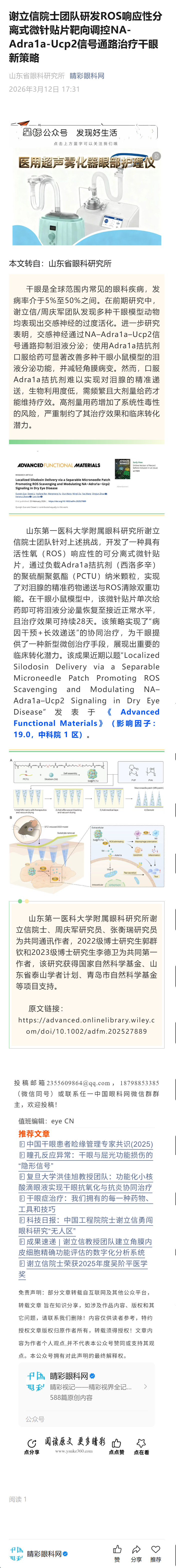 新闻中心 您的当前位置:首页 > 新闻中心 > 谢立信院士团队研发RO 谢立信院士团队研发ROS响应性分离式微针贴片靶向调控NA-Adra1a-Ucp2信号通路治疗干眼新策略----2026-3-12 发布时间:2026-03-12 来源: 作者: